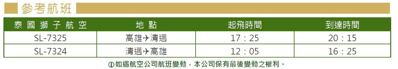1. 泰獅航空高雄清邁直飛來回經濟客艙含兩地離境機場稅和燃油稅金。