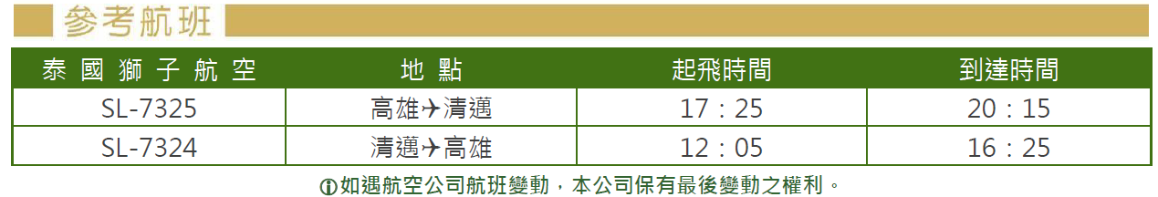 1. 泰獅航空高雄清邁直飛來回經濟客艙含兩地離境機場稅和燃油稅金。