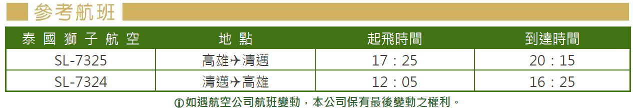 1. 泰獅航空高雄清邁直飛來回經濟客艙含兩地離境機場稅和燃油稅金。