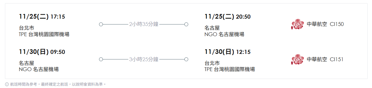 愛知或歧阜→名古屋中部國際機場/桃園機場