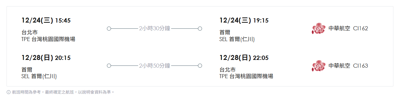 (受特殊區間各航空不同專案或活動影響,可能當團而有所不同。)