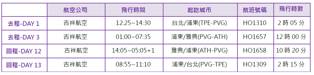 註:機上餐僅提供 新加坡→雅典(一餐)、雅典→新加坡(一餐)