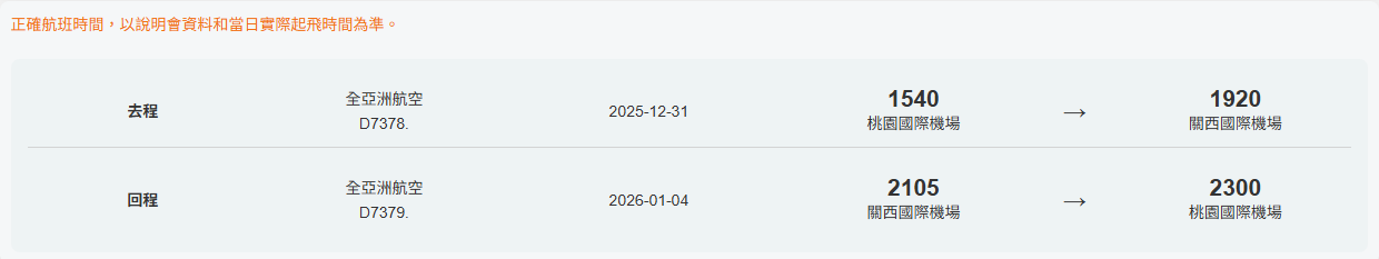 4.本行程班機起降時間為預定,但實際可能略有變更。