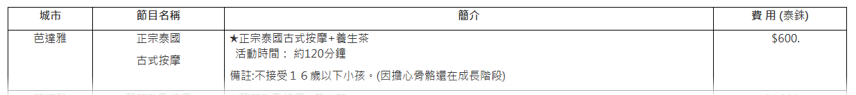 ◆古式按摩:您可以視按摩師的服務品質或專業水準彈性的給予小費,約100元泰銖。