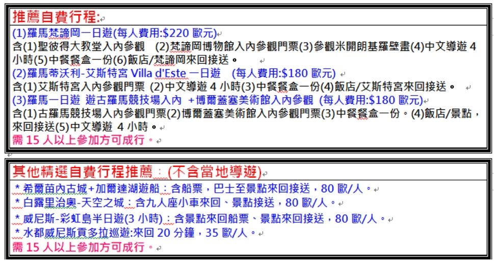 2.行程表上未表明之各項開支,自選建議行程交通及應付費用。