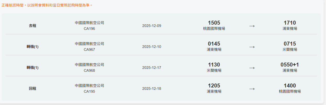 米蘭 → 上海