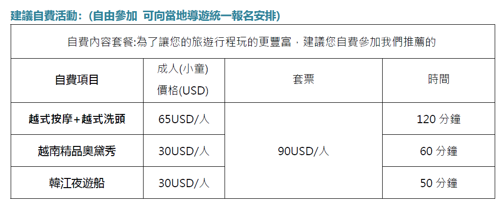 2. 行程表上未表明之各項開支,自選建議行程交通及應付費用。
