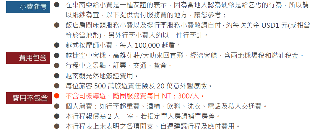 ● 行程中越式風味餐食,因民情風俗差異,有些餐廳圓桌 8~10 位一桌,有些方桌 4~6 位一桌,依當地實際狀況安排。此地並不盛行素食,餐廳可製作素菜的種類偏少或重複性高,有素食需求的旅客建議可自備罐頭、乾糧或素食泡麵,以備不時之需。