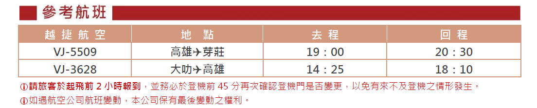● 實際班機起降時間需以航空公司為主,本公司唯有配合變更,旅客並不得以航班時間問題為由更改出發日期,造成您的不便之處,敬請見諒!