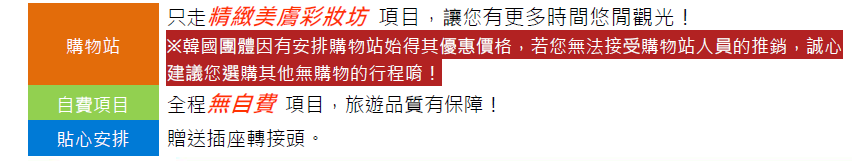 購物是旅行的樂趣之一,而能以一般賣場更便宜的價格購買服飾、皮包等流行精品的折扣購物中心,則是享受血拼樂趣的好去 處。韓 國的折扣購物中心多位於城市的市區或近郊,從世界名牌到韓國人氣品牌等應有盡有,吸引許多遊客前往。而有些折扣 購物中心甚至 打造得如同主題樂園一般,更有眾多精緻的餐廳,適合花一整天慢慢逛。 **本行程不指定前往的OUTLET,由導遊依照團員屬性、天候、車況做最好的安排。(參考前往 OUTLET有 : 松島或驪州或金浦)因前往的 OUTLET 不同,行程成順序可能有所調整。