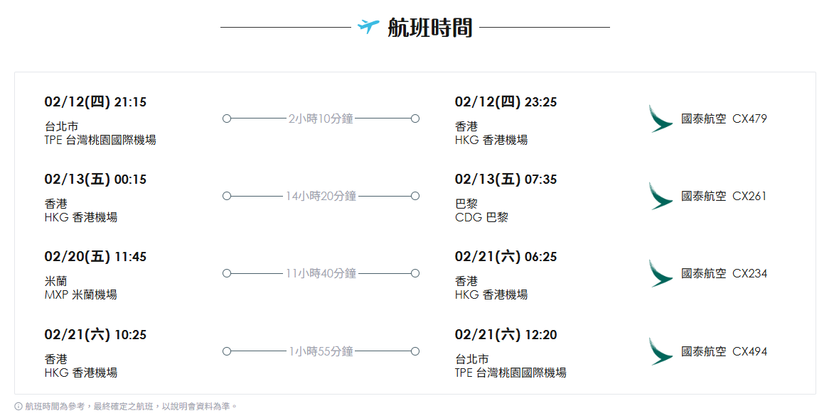 上述行程視航空班次的確認,本公司保留調整之權利,以出發前說明會提供之資料為主