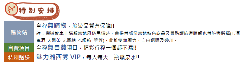 3.以上行程順序若因特殊狀況及其他不可抗拒之現象;如天候、交通、航班、船舶影響,而有飯店、景點餐食順序上之調動依當地視情況調整絕對以最順暢之行程作為安排,但行程景點絕不減少,敬請見諒!