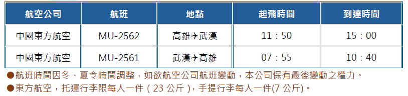 6.各航空公司規定行李托運公斤數參考如下:(若超過規定額度,旅客需依航空公司規定額外自付加收費用)長榮航班、中華(華信)航空、國泰航空、東方(上海)航空、南方航空、四川航空、海南航空、中國國際航空、吉祥航空、廈門航空、山東航空,托運行李以每人一件(23公斤)為限。手提行李以每人一件(7公斤)為限。