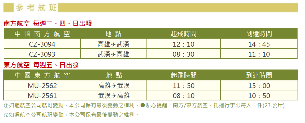 國家歷史文化名城、楚文化的重要發祥地;清末洋務運動促進了武漢的工業興起和經濟發展,使其成為近代中國重要的經濟中心。武漢是中國民主革命的發祥地,武昌起義作為辛亥革命的開端,具有重要歷史意義。 ※溫馨小提示:高雄飛武漢此班機機上無供熱食(機上輕食為:1 小包黃飛鴻花生+1 小包海苔餅干+1 瓶耶奶+飲料),建議旅客可搭機前自行購買一些小吃(如壽司、三明治、飯團…等等)!