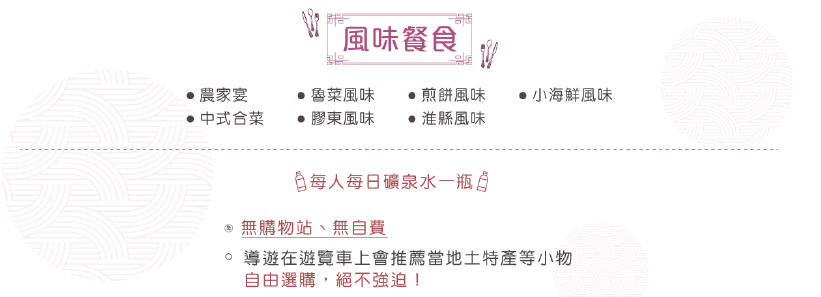 #以上行程順序僅供參考,實際行程順序以團體行進順利為準# #以上行程景點/餐廳/飯店如遇安全/政府徵收/景區關閉或維修等不可控因素,旅行社有調整權利,若無法接受,請勿報名!# #本行程團費所含景點門票均已分攤老人/小孩等優待票差價,亦不另行退還差價,請配合出示證件,若無法接受,請勿報名!# 70歲以上或特殊旅客參團注意事項 #若有行動不便、慢性疾病、年滿70歲以上之貴賓,請主動告知。 #為考量旅客自身之旅遊安全及行程順暢度,並顧及同團其他團員之遊覽權益,行動不便之貴賓,需與能獨立照顧您之家人或友人同行(家人/友人年齡需未滿65歲)。 以上2點需經敝公司評估,方始可接受報名。若報名付訂金後臨時告知取消,將收取相關必要費用,敬請見諒 #中國大陸地區每年4、5月及10、11月季節交替期間,氣溫約13-22攝氏度,晝夜溫差大;酒店須配合政府環保節能政策,於此期間僅提供送風模式,無法提供冷氣;一般冷氣開放時間為5月底至9月底,具體時間以各酒店實際狀況為主,造成不便,請見諒!