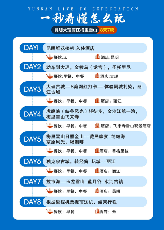 (溫馨提示:初上高原,請注意不要剧烈運動和過量飲酒,入住酒店後注意休息,做好體力儲備,雲南早晚溫差較大,請您注意添減衣物)