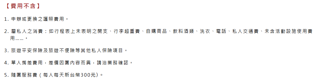 7. 包含的行程及餐食若客人不參加者,視為自動棄權,恕無法退費。