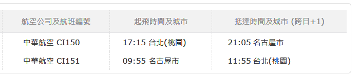 桃園國際機場/新特麗亞名古屋中部國際機場