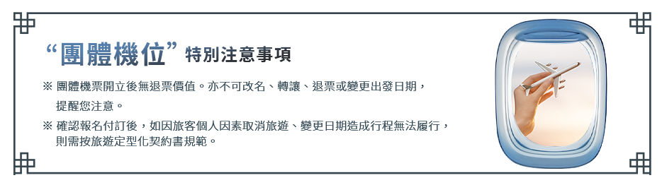 團體座位由航空公司安排,不適用於出發前預先選位,也無法確認座位相關需求(如靠窗、靠走道等),且座位安排乃依英文姓名依序排列,同行者有可能無法安排在一起。
