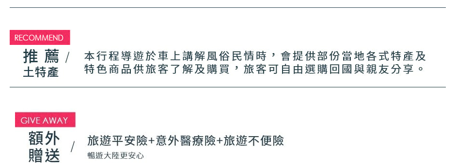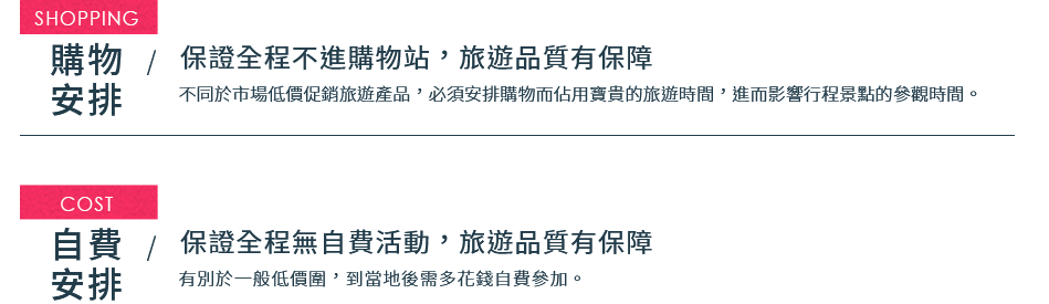 · 本行程設定為團體旅遊行程,故為顧及旅客於出遊期間之人身安全及相關問題,於旅遊行程期間,恕無法接受脫隊之要求;若因此而無法滿足您的旅遊需求,建議您另行選購團體自由行或航空公司套裝自由行,不便之處,敬請原諒。