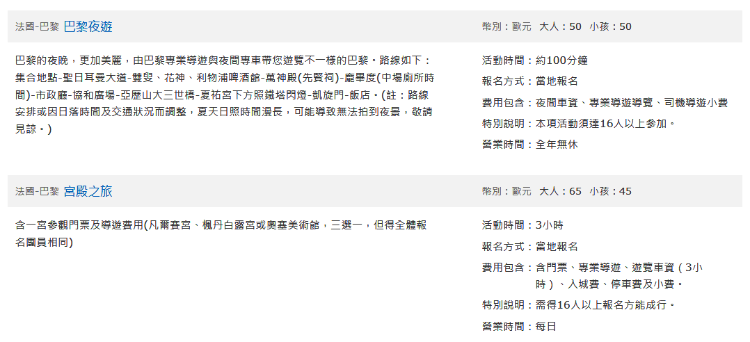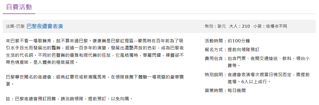 給予服務人員小費是全世界通行的社會習慣之一,在國外旅行大多有付小費的習慣,是一種風度的表現。本行程不包含領隊、導遊、司機服務費:每位貴賓每日12元(歐元)×天數。例如:10天團體共計120歐元,以此類推.........