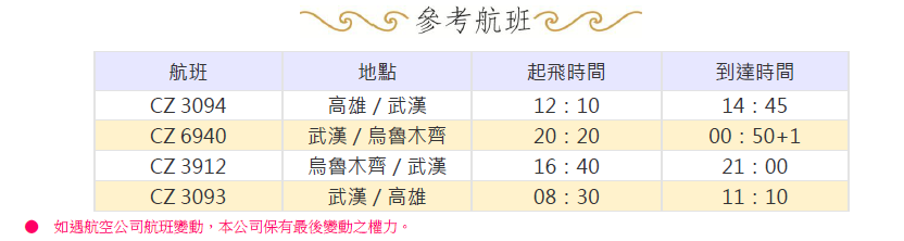 ●武漢段中轉接駁使用常規四排椅,本公司保有最後變動之權力。