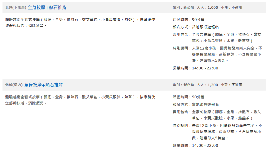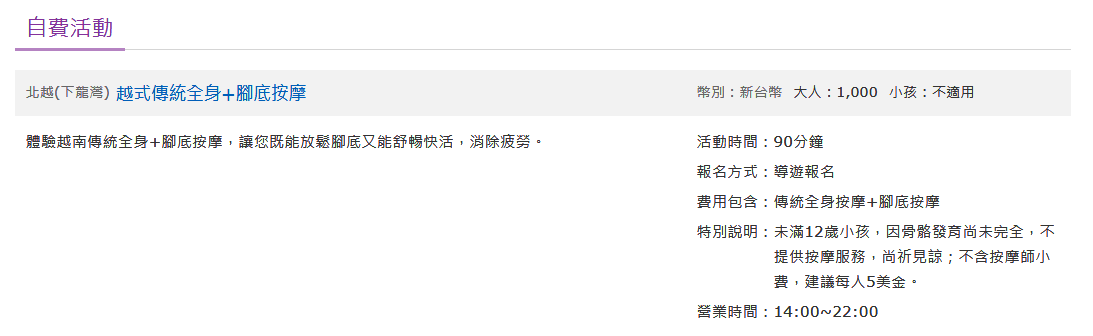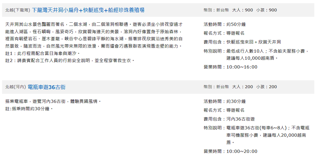 專車前往專屬碼頭搭乘遊船出海遊覽,啟航前往下龍灣,開始新世界七大奇景之旅,並途經參觀下龍灣的地標。 在碼頭登上下龍灣國賓號日遊船Ambassador Cruise:下龍灣目前最大最豪華全新日遊船,2023年2月10日下水,擁有獨特的雙甲板露臺,兩間共可容納500名乘客的豪華餐廳,⼀個露天按摩⽔池,可以360度俯瞰下龍灣,船頭突出的五米玻璃橋更是可拍出引⼈入勝的照⽚,國賓號日遊船提供全新舒適的遊船活動,為乘客帶來難忘的體驗。 驚訝洞(入內參觀):下龍灣最漂亮的石灰岩洞之一,從下船處得登上約100階階梯才到入口,整座灰岩洞佔地超過1萬平方公尺,洞內千奇百怪的鐘乳石、石筍、鐘乳石柱,形體各有異趣。洞頂上有著宛如蜂巢般的小岩穴,高挑的洞頂,打造出渾然天成的空間,加上七彩燈光的襯托,照亮洞內岩壁,奇幻的地底世界令人嘖嘖稱奇,大自然鬼斧神工的力量更是讚嘆。 英雄島(上島參觀):西元1962年胡志明與蘇聯太空英雄Gherman Titov一同造訪,為了紀念與蘇聯的友誼,胡志明就以Titop為這座小島命名。Titop島有難得一見的月牙型沙灘,這是在下龍灣少數擁有細沙的白沙灘,還有一座蒂托夫紀念雕像,島上有一涼亭,登上400多階階梯來到景觀台,在這裡擁有360度無死角的寬廣視野,居高臨下細數散落在下龍灣的不同島嶼與來往的船隻,景觀台也是申請世界自然遺產照片的最佳取景處。 船上自助午餐:提供精緻美味的自助式午餐,豐富的菜色包含了越式、中式、西式等的跨國料理。 ●若當日搭船人數未達30人,將改為船上中式合菜或個人套餐。 1.行程將以「國賓號遊船」為主,遇船班客滿或其它主客觀因素時,將改以其他下龍灣遊船替代,船上餐食依替換遊船之船上提供為主。 2.團體作業恕無法接受指定遊船。 3.下龍灣行程若遇當時天候不佳,如:颱風、大霧等狀況影響到安全,當地政府官方管理單位管制碼頭遊船,無法出海,當天午餐安排於岸上餐廳,並安排廣寧博物館替代行程,敬請見諒。 4.船隻停靠碼頭,上下岸時請注意個人安全,並請配合導遊、領隊、指導員宣達的相關注意事項,並務必穿上救生衣具,謝謝合作! 5.因應下龍灣禁用一次性塑膠用品,故建議上船時自備水瓶方便使用。