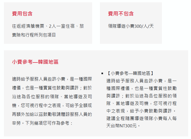 *.非本國籍旅客:本行程所載之相關規定,對象均為持中華民國護照之旅客,若您擁有雙重國籍或持他國護照,請自行查明相關規定,並事先請告知您的業務人員。台灣出境時,持外國護照的貴賓(如:美國護照),航空公司會要求客人提出入境該國之回程機票(就是從台灣回美國的機票),不然就需於航空公司櫃台簽一些保證資料,有時怕會擔誤搭機時間,請參團的貴賓若有持外國護照的,需攜帶該護照之回程機票,或者貴賓有台灣護照也同時帶出國即可。若您是持外國護照進入韓國,外站有規定回程時機場櫃台會要求看台灣至該國的回程機票證明,或外國人在台灣的居留證,請各位貴賓務必於出國前事前準備好,以防回程辦CHECK IN時所需。