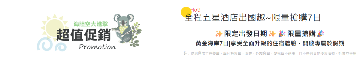 黃金海岸→整天悠閒自由活動~推薦行程【清晨熱氣球之旅、螃蟹河之旅、 夜晚自然橋螢火蟲國家公園】→黃金海岸