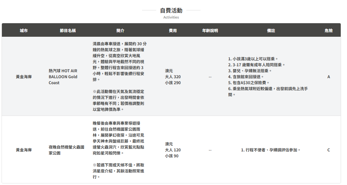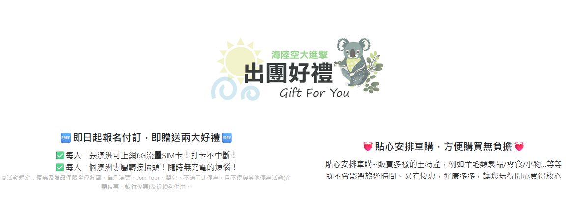 如遇旅遊旺季,熱門景點如:雪梨歌劇院、擁抱無尾熊體驗、藍山交通工具搭乘體驗、神仙小企鵝夜歸巢、普芬比利古董蒸氣火車,若因預訂額滿、公休或維修等狀況,導致無法按照原定安排,會改以其他替代行程或退費方式處理,造成不便,敬請見諒。