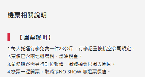 ※團體機票一經開票無退票價值,故於開票後或當日臨時取消出發者,無法辦理退票。