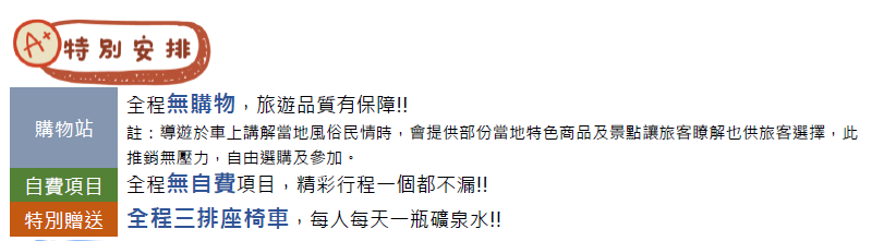 3.以上行程順序若因特殊狀況及其他不可抗拒之現象;如天候、交通、航班、船舶影響,而有飯店、景點餐食順序上之調動依當地視情況調整絕對以最順暢之行程作為安排,但行程景點絕不減少,敬請見諒!